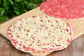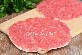 Говяжий фарш перемешиваем с солью и молотым перцем. Пока только на 2 лепешки с помощью большой ложки тонким слоем распределяем половину фарша (по 62-63 г).