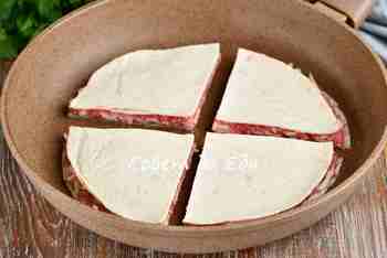 Второй лепешкой только с фаршем накрываем лепешку с фаршем и сыром. По всей поверхности прижимаем пальцами. Разрезаем лепешки на 4 части.
