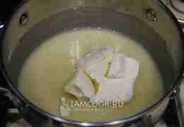 Убираем с плиты, кладём 110 г мягкого сливочного масла и мешаем, пока не растает. Переливаем в миску, накрываем в контакт плёнкой.