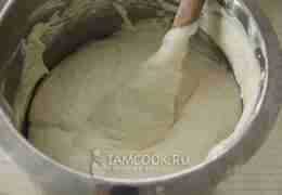 Просеиваем 150 г муки – вводим её в несколько заходов, осторожно перемешивая снизу вверх. Тесто будет воздушным и лёгким.