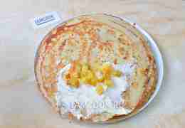 Берём по одному блину, смазываем его маскарпоне – примерно столовая ложка на порцию. Сверху кладём ложку грушевой начинки. Сворачиваем в рулет или конверт.