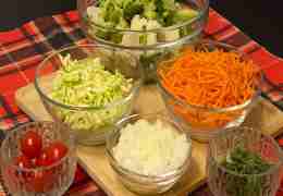 брокколи и цветную капусту. Всё вместе готовлю около 10 минут, в конце солю и перчу. Овощи слегка остужаю.