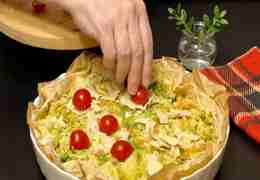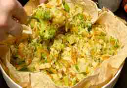 Форму застилаю пергаментом, укладываю лаваш так, чтобы края заходили на бортики. На дно, первый слой сыра. Сверху распределяю овощи, смешанные с яичной заливкой.