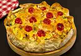 Вместо греческого йогурта подойдёт сметана или мягкий творог, пробитый блендером до однородности. Густота заливки при этом почти не меняется. Овощи здесь можно брать любые. Остались с ужина обжаренные грибы, отварная курица или немного шпината, всё смело добавляйте. Замороженные овощные смеси тоже подходят, только дайте им оттаять и отожмите лишнюю воду, иначе дно размокнет.