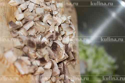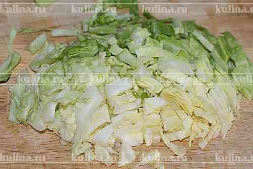 Шампиньоны мелко нарезать, положить к капусте, перемешать.