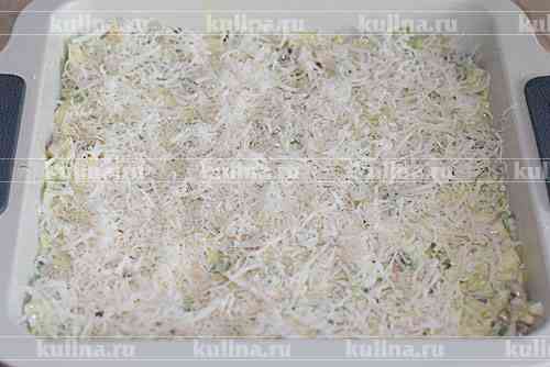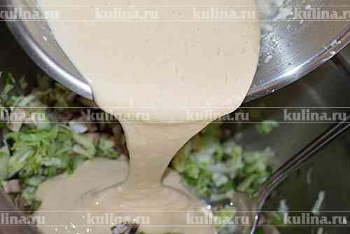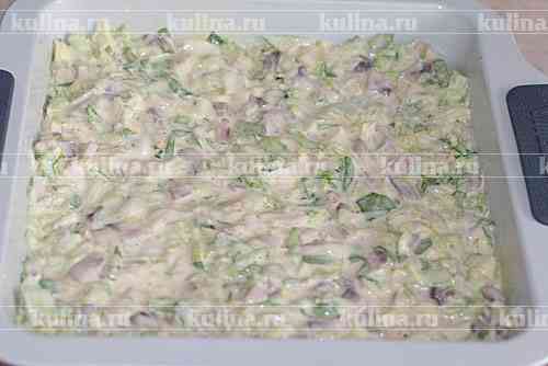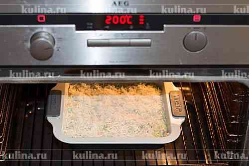 Форму для выпечка смазать растительным маслом, выложить содержимое миски, разровнять.
