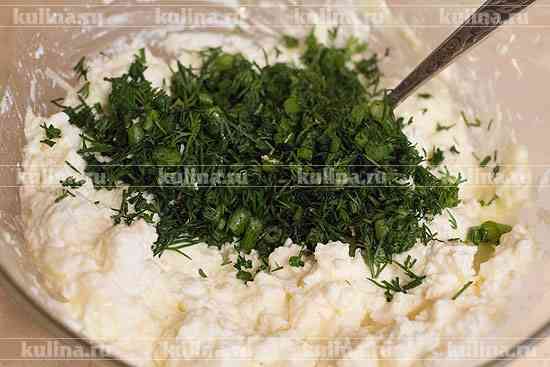 Зелень укропа мелко нарезать, выложить в миску, перемешать. Солить начинку или нет, решать вам. У меня брынза была достаточно соленой,