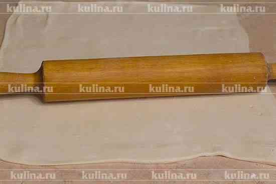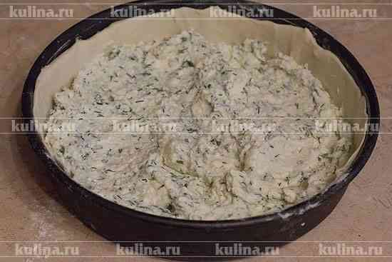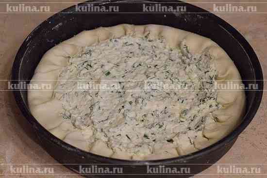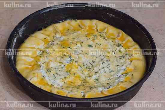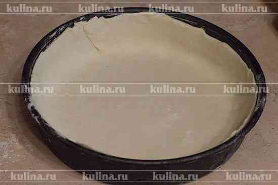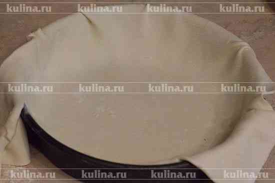 Форму для запекания смазать маслом. Перенести тесто в форму так, чтобы оно свисало с бортиков формы.