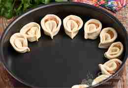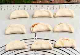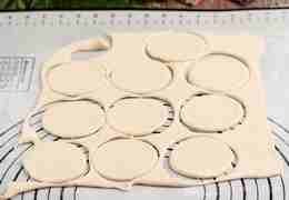 Раскатываем пласты теста не очень тонко и вырезаем кружочки (диаметр 7 см). Остатки теста округляем и снова раскатываем.