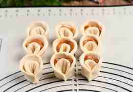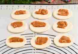 На каждый кружочек ближе к одному краю выкладываем небольшое количество вареной сгущенки. Из каждого пласта теста получается 17-19 заготовок.