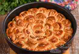 Как только пирог хорошо зарумянится, вынимаем из духовки. Такая форма пирога не дает начинки вытекать наружу и затем на дно пирога.
