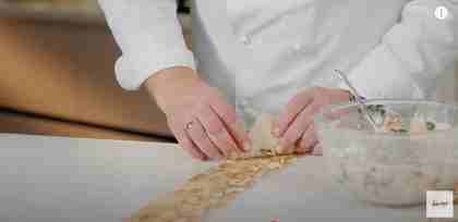Раскатываем лаваш и нарезаем его на полоски под размер пирожков. Выкладываем начинку на край полоски и начинаем заворачивать пирожок в форме треугольника. Край обязательно заправляем в «кармашек» лаваша.