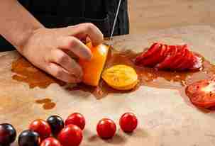Помидоры нарезать: крупные — толстыми кружками, мелкие — на половинки.