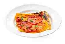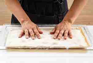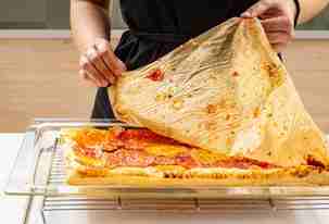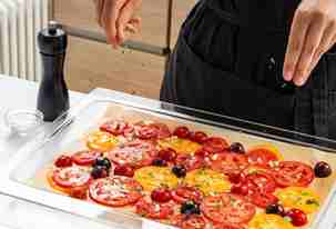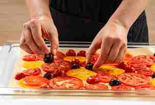 Накрыть тестом помидоры и надавить на него сверху ладонями для более плотного контакта по всей поверхности.