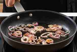 Лук нарезать кольцами и отдельно обжарить на оливковом масле до мягкости и золотистого цвета и выложить к помидорам.