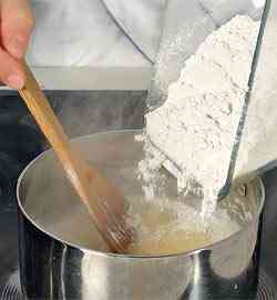 Вскипятить 200 мл воды, добавить сливочное масло, по щепотке сахара и соли. Смесь хорошо размешать и постепенно всыпать просеянную муку.
