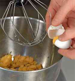 Охладить тесто до 60°–70° C и постепенно, по одному, ввести все яйца, взбивая до однородной массы.