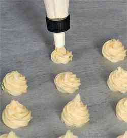 Разогреть духовку до 200° C. Переложить тесто в кулинарный мешок и отсадить на смазанный маслом и застеленный пергаментом противень в виде небольших