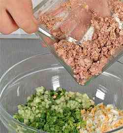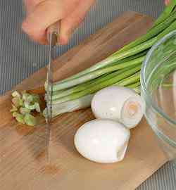 Яйца очистить, зеленый лук промыть, все мелко нарезать. Печень трески обсушить на бумажном полотенце и размять вилкой.