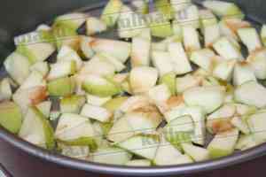 Яблоки очистить от семянной коробки и нарезать небольшими кубиками. Форму для выпечки смазать маслом, выложить яблоки. При желании форму посыпать