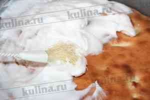 Отделить два белка от желтков, взбить их в пену вместе с сахарной пудрой. Нанести крепко взбитые белки на поверхность готовой шарлотки. Поставить на