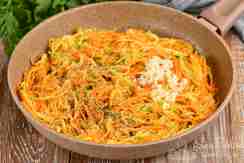 Морковь и кабачок натираем тонкой соломкой. Морковь обжариваем в масле на сильном огне 3 минуты (не накрываем). Добавляем кабачок и готовим 5 минут.