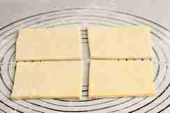 Берем 2 пласта размороженного слоеного бездрожжевого теста. Разрезаем каждый пласт на 4 части (итого 8 заготовок).