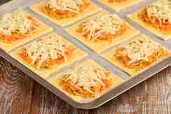 Тесто перекладываем на противень, добавляем посередине начинку, посыпаем натертым полутвердым сыром, края теста смазываем яйцом и выпекаем в разогретой духовке при 180° C 25 минут.