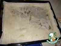 Сливочное масло растопим. На противень хорошо смазанный сливочным маслом выкладываем первый лист теста. Затем обильно смазываем лист