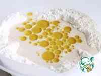 В другую емкость насыпать муку. Сделать в середине углубление. В это углубление вылить дрожжи, а затем и воду с солью и оливковым маслом.