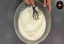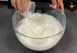 Перемешиваем венчиком до однородности, высыпаем несколько ложек просеянной муки, которую также берём из общего количества, указанного в рецепте. Доводим опару до консистенции жидкой сметаны.
