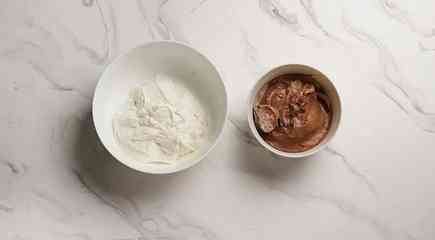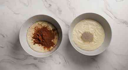 Тесто разделите на 2 равные части. В одну добавьте какао-порошок и перемешивайте