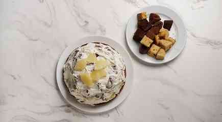 На ананасы распределите кубики ванильного и шоколадного бисквита, чередуя их