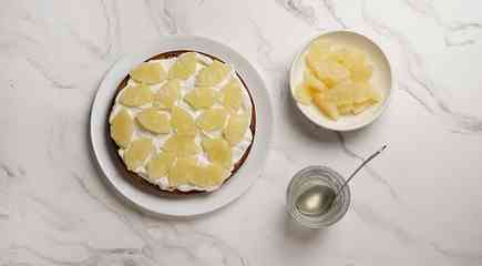 Целый ванильный корж пропитайте ананасовым соком, а сверху равным слоем