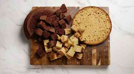 основу. Второй корж и шоколадный бисквит целиком нарежьте кубиками стороной по