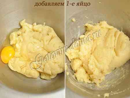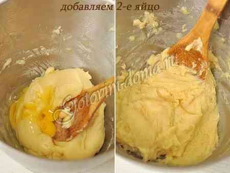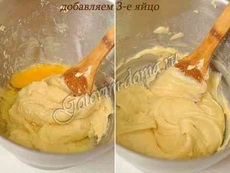 Остудить тесто, разминая ложкой или лопаточкой, пока оно не станет теплым на ощупь (если добавлять яйца в горячее тесто - яйца свернутся).
