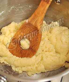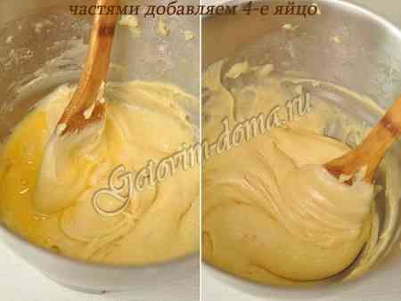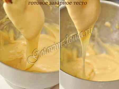 Готовое тесто должно быть блестящим, хорошо вымешанным и однородным. Тесто сползает с ложки широкой тяжелой лентой.
