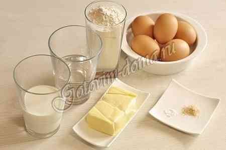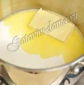 Просеять муку. В кастрюлю налить молоко с водой, добавить масло, щепотку соли и сахара.