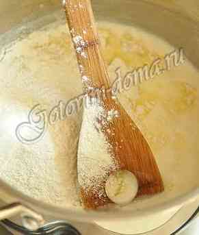 Интенсивно перемешать деревянной ложкой, чтобы жидкость в кастрюле находилась в круговом движении. Всыпать за раз всю муку.