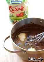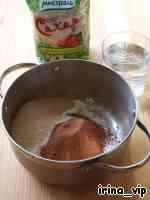 половину нормы коричневого сахара и просеянный через сито какао-порошок, добавить холодную воду, перемешать и поставить кастрюлю на плиту.
