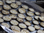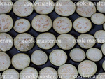 Противень смазать растительным маслом. Баклажаны нарезать кружочками, выложить на противень.