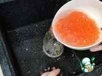 Более мелкие фракции ястыка (пленки) удаляем руками, либо путем промывания, наклоняя емкость с икрой, вода будет вытекать вместе с