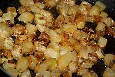 Кабачок очистить, нарезать кубиками и обжарить мякоть в растительном масле.