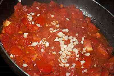 Помидоры нарезать и обжарить в масле. Добавить в сковороду измельченный чеснок.