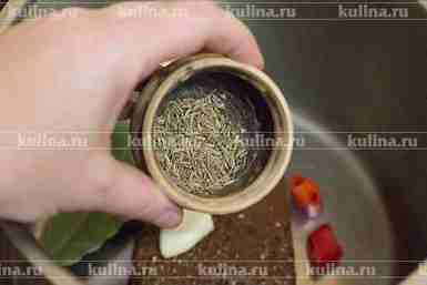 Чеснок разрезать пополам, перец кусочками, 1/2 части положить в кастрюлю. Добавить лавровый лист и перец горошком