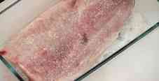 Разделываем карпа на филе: удаляем внутренности и отрезаем плавники. Посыпаем форму для карпа солью и сахаром. Выкладываем одно филе в