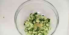 Нарезаем огурцы мелким кубиком, солим, заправляем мёдом и соком лайма.