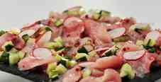 Выкладываем филе карпа на блюдо. Украшаем огурцами, редисом и розовым перцем. Приятного аппетита!