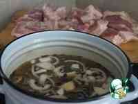 В большой кастрюле "заводим рассол". Вода, соль, перец... ну и так далее. Лук порезать крупными лепестками, чеснок - дольками пополам.