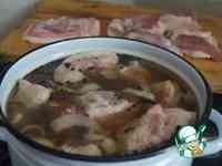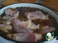 Опускаем в кипящий рассол сало, которое будет у нас "варёным". Доводим до кипения и кипятим 5-7 минут. Крупные рёбра с мясом - сюда же.